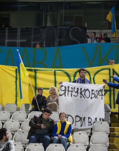 Мачът започна с минута мълчание в памет на жертвите в Киев. На трибуните украинци вдигнаха транспаранти срещу президента Виктор Янукович.
