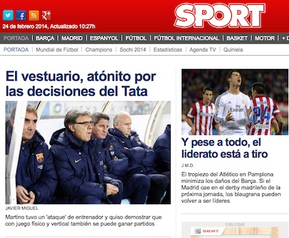 Издънката на Барселона срещу Реал Сосиедад (1:3) увеличи напрежението върху наставника Херардо Мартино. В днешния си брой флагманът на каталунския клуб вестник "Sport" излиза с водещ материал, насочен срещу аржентинеца. Изданието, чийто мото е "Винаги с Барса", критикува Тата за отношението му към срещата в Сан Себастиан. "Всички в съблекалнята са изненадани от решенията на Мартино. Треньорът беше толкова неориентиран, че след мача не говори с никого от отбора", пише излизащият в Каталуня вестник.