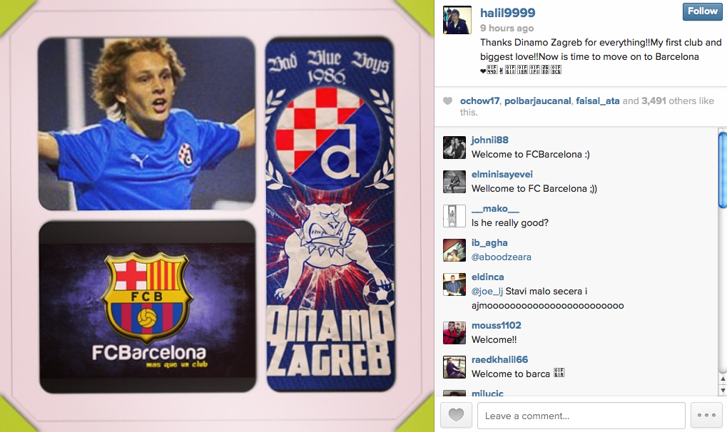 "Благодаря, Динамо (Загреб), за всичко! Моят първи отбор и най-голяма любов! Сега е време да премина в Барселона", написа Халилович.