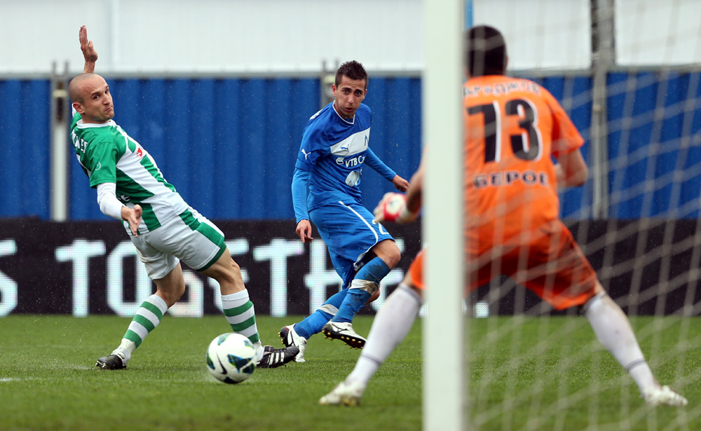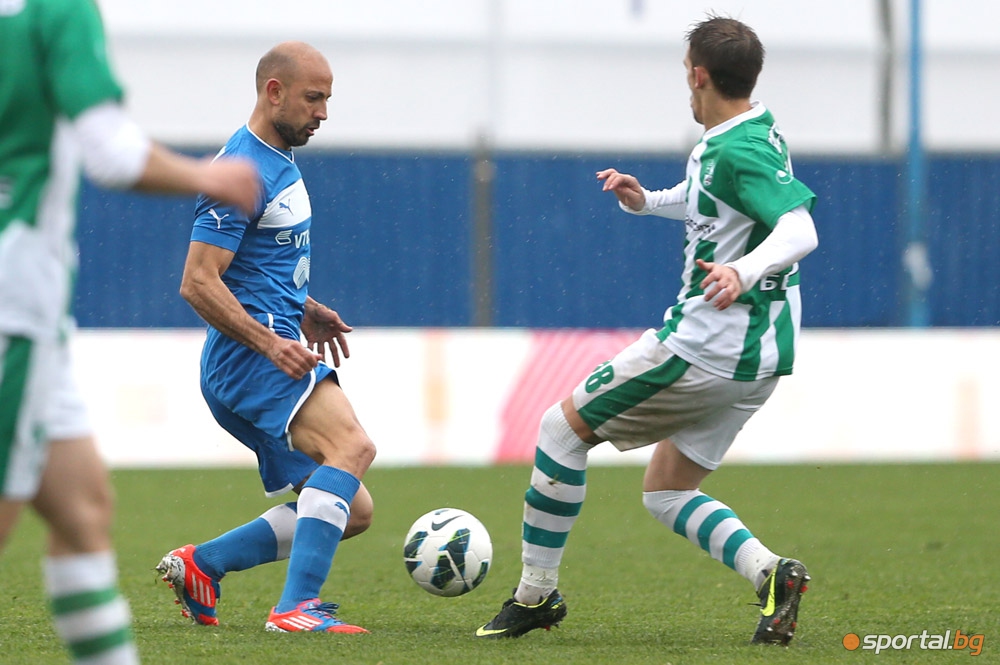 удар на Карвальо и с десния крак вкара своя четвърти гол за сезона. Попадението стресна гостите, докато "сините" бяха близо до втори в 28-ата минута. Караджов изби удар на Родригес, а Карвальо от два метра стреля висока над вратата при добавката. Голмайсторът на "А" група все пак прекъсна головата си суша в 30-ата минута. Той се разписа с корем, след като плонжира при прострелно центриране на Йорданов. Попадението е негово 16-о за сезона и първо от мача с Черноморец в Бургас на 3-и март.