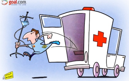 В поредната любопитна карикатура на сайта Goal.com нападателят на Барселона Лионел Меси изхвърчава от линейка с ясната идея да помогне на съотборниците си да елиминират Пари Сен Жермен. Вчера Меси, който все още не е напълно възстановен от контузия, се появи в игра през второто полувреме на четвъртфиналния мач-реванш от Шампионската лига на каталунците с ПСЖ. Тимът на Тито Виланова губеше с 0:1 в резултата (след 2:2 в първата среща в Париж), когато Меси влезе в игра под аплодисментите на публиката. Влизането на аржентинеца се оказа решаващо, тъй като той имаше важно участие при изравнителния гол на Педро Родригес. Реваншът завърши 1:1 и това бе достатъчно на Барселона да се класира на полуфиналите, благодарение на правилото за повече отбелязани голове на чужд терен.