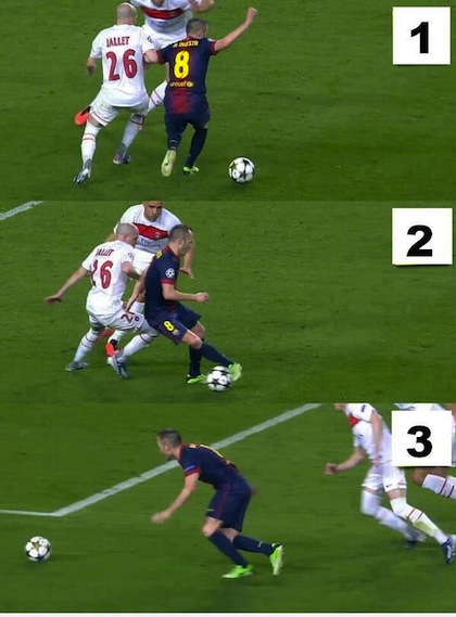 Халфът на Барселона Андрес Иниеста буквално скри топката на защитниците на Пари Сен Жермен Алекс и Кристоф Жале в края на мача-реванш между двата тима от четвъртфиналите на Шампионската лига на "Камп Ноу". Вижте майсторския финт на Иниеста, с който той се освободи от двамата бранители на ПСЖ и отправи удар с левия крак от малък ъгъл, който обаче не намери очертанията на вратата на френския тим.