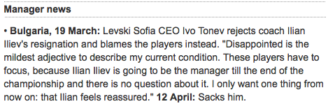Колегите от Острова са цитирали изявлението на Тонев в дните след мача с Монтана на "Герена": "Разочарован е най-мекото прилагателно, което да опише състоянието ми. Играчите трябва да се концентрират, защото Илиан Илиев ще бъде треньор до края на сезона и в това няма съмнение. Искам само едно нещо: Илиан да се чувства спокоен". Цитатът е с дата 19 март. "12 април: Уволнява го", добавя "Гардиън".