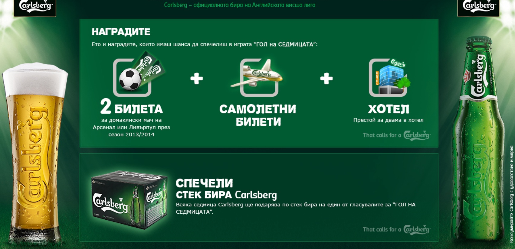 Официалната бира на английската Висша лига Carlsberg е подготвила страхотни награди за участниците в играта "Гол на седмицата" в Sportal.bg, която можете да откриете тук. Гласувайте всяка седмица, регистрирайте се и участвайте за два билета за домакински мач на Арсенал или Ливърпул през идния сезон 2013/14. Carlsberg подсигурява двата билета по избор, самолетните билети и хотел за двама.