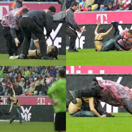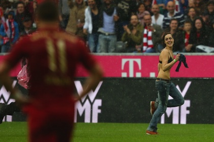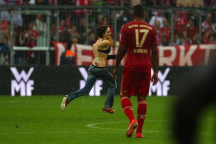 Млада дама нахлу на терена по време на двубоя на Байерн (Мюнхен) с Фрайбург от германската Бундеслига и започна да се съблича, но, за съжаление, стюардите успяха да я спрат да захвърли всичките си дрехи. Жената дефилира по черен сутиен и заслужи аплодисментите на феновете на "Алианц Арена". Баварците, които вече спечелиха титлата, надделяха в мача с 1:0 след попадение на Джердан Шакири след 35 минути игра.