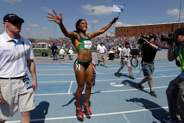 Постижение №1 в света за сезона беше постигнато и на 100 м/пр при жените. Победата извоюва Куин Харисън с 12,71 сек. Тя остави след себе си сребърната медалистка от Олимпиадата в Лондон 2012 Доун Харпър (12,74 сек), бронзовата медалистка от Игрите Кели Уелс (12,78 сек) и двукратната световна шампионка в зала Лоло Джоунс, която остана четвърта с 12,79 сек.