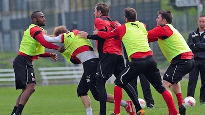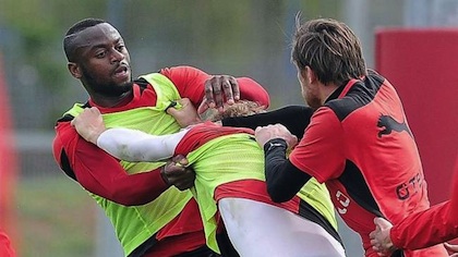 Напрежението в лагера на застрашения от изпадане Фортуна (Дюселдорф) става нетърпимо. Вчера се стигна до третото сбиване между футболисти на тима в рамките на само две седмици. Първите два инцидента са били прикрити, но последната разправия беше уловена от фотообектива на "Билд". Участници в нея бяха халфът Адам Боджек и нападателят Нандо Рафаел. Първият изнерви тъмнокожия си съотборник, след като му влезе остро при единоборство. Рафаел пробва да удари Боджек с глава, но не уцели. Полузащитникът веднага отговори с шамар, при което също получи плесница. След това Боджек тръгна да бяга, а Рафаел го гонеше със стиснати юмруци. Тук вече се намесиха останалите играчи и сбиването беше прекратено. Съперниците в схватката обаче продължиха да си разменят обиди и трябваше да бъдат разделени по пътя им към съблекалнята.