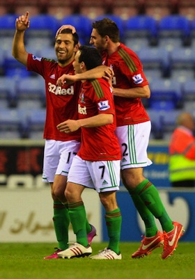 Анхел Ранхел. Той стреля от въздуха след центриране на Уейн Раутлидж и прати топката в мрежата. Джеймс Макарти отново изведе Уигън напред, но и този път радостта на "латикс" продължи твърде кратко. Груба грешка в отбрана позволи на Итай Шехтер да вкара за 2:2 в 59-ата минута, а в 79-ата Дуайт Тиендали наказа поредното объркване на защитниците в синьо и бяло, и донесе победата на Суонзи.