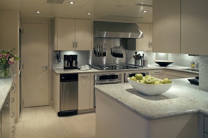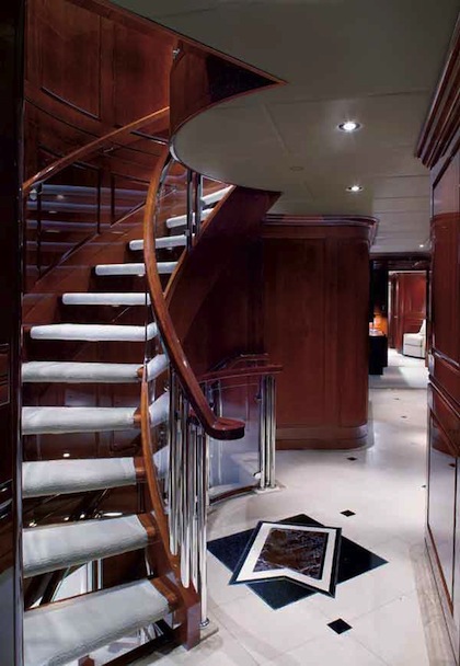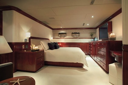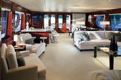 В яхтата има просторна дневна с 50-инчов плазмен телевизор, еспресо машина Miele, а за по-лесно придвижване между палубите има и асансьор.