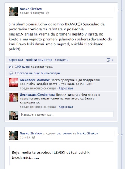"Сини шампиони. Едно голямо "Браво". Специално да поздравим треньора за работата в последния месец. Нямаше време да промени нищо в играта, но което е най-важното - промени желанието и себераздаването докрай. Браво, Ники, давай смело напред, всички ти стискаме палци", написа клубната легенда в профила си във "Фейсбук".