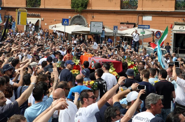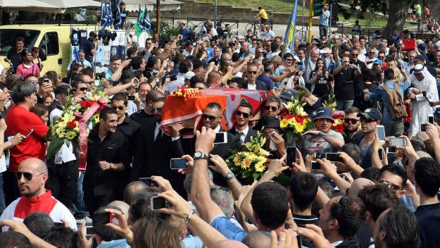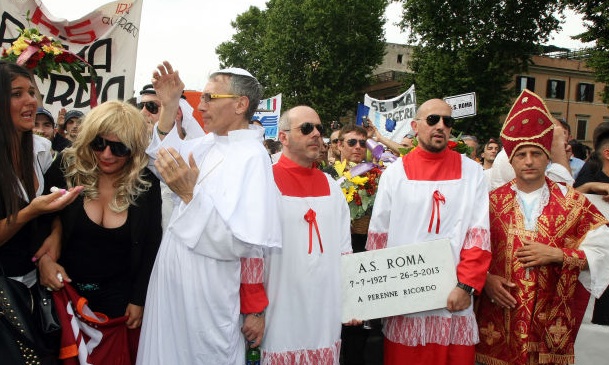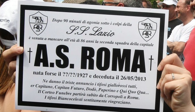 Две седмици след историческия успех във финала за Купата на Италия на Лацио срещу вечния съперник Рома тифозите на "орлите" продължават да празнуват. Вчера хиляди от тях се събраха в италианската столица Рим и се подиграха на "вълците", като им направиха публично погребение. Тифозите на Лацио понесоха огромен ковчег, покрит със знамена на градския съперник. Успехът с 1:0 във финала, който бе първи в историята между двата отбора, още повече раздели вечния град на две. "Небесносините" не спират да празнуват, докато "джалоросите" ближат раните си след проваления сезон.