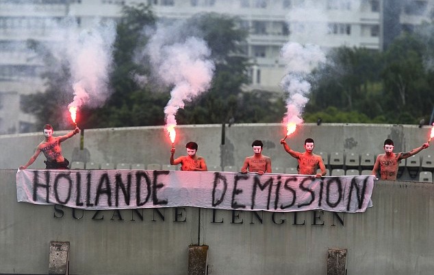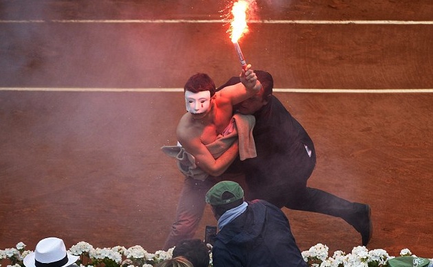 Малко преди това играта отново бе прекъсната от четирима други протестиращи, които също запалиха факли на покрива на корт "Сюзан Ленглен" и скандираха за оставката на френския президент Франсоа Оланд.
