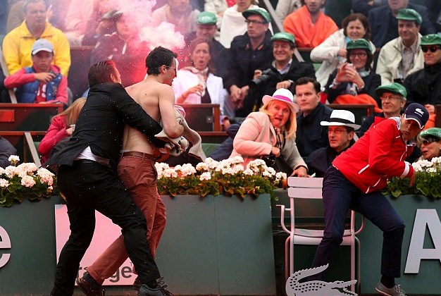 Драматични сцени прекратиха за кратко финалния двубой на откритото първенство на Франция по тенис "Ролан Гарос" между испанците Рафаел Надал и Давид Ферер, завършило с убедителна победа на Надал с 6:3, 6:2, 6:3. В края на втория сет, когато Надал сервираше за спечелването му, на корта нахлу маскиран фен, запалил сигнална факла и изписал върху голото си тяло призив за повече права на децата.