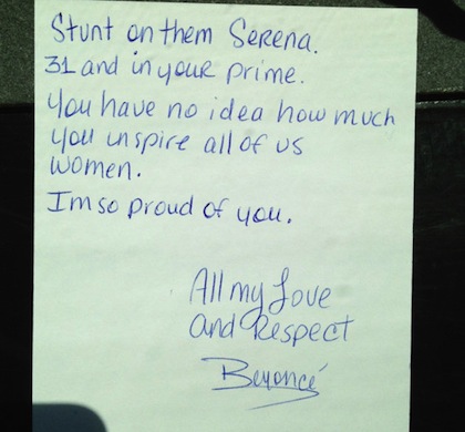 "Покажи им, Серина! На 31 ти си в разцвета на силите си. Нямаш представа колко много вдъхновяваш всички нас, жените. Много се гордея с теб. С цялата ми любов и уважение, Бийонсе", пише в писмото на певицата до тенисистката.