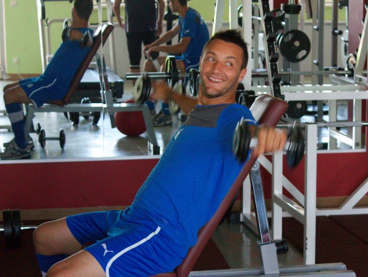 Четирима от футболистите на Левски тренираха във фитнес залата в Линдабрун в единственото за деня занимание на подготвителния лагер. Това бяха болният Христо Попадийн, оплакващите се от болки Даниел Димов и Борислав Цонев, както и получилият почивка Орлин Старокин.