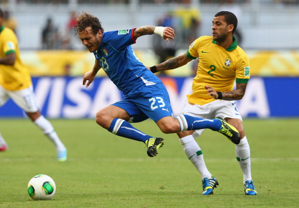 т първото. Още в началните секунди се стигна до положение пред вратата на Италия. Фред спря топката за Оскар, който отправи удар от границата на наказателното поле, но Буфон улови. Италия пък отговори с далечен изстрел на Антонио Кандрева преминал над вратата. В 51-ата минута обаче гостите стигнаха до изравняване на резултата. Буфон прати една топка в предни позиции, Кандрева успя да се пребори и с глава я продължи към Марио Балотели, който пък с пета намери Джакерини в наказателното поле и той със силен удар възстанови равенството в мача - 1:1.