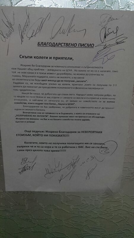Искрено Ви благодарим за човечното отношение и съпричастността към Нашият общ проблем - изпадането на ЦСКА. На когото не му се е налагало, само той не знае какво е в тежък момент да разбереш, че можеш да разчиташ на помощ. Моралната подкрепа, която ни оказвате, е по-силна от сполетяната ни беда шест месеца да не получим "заплати".