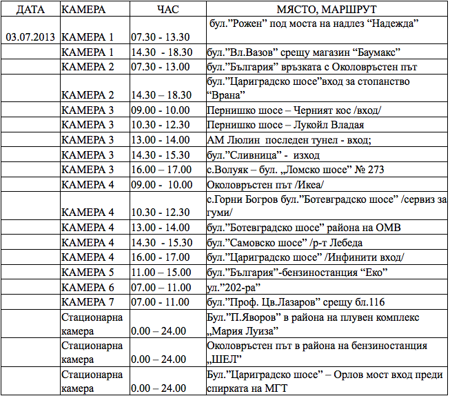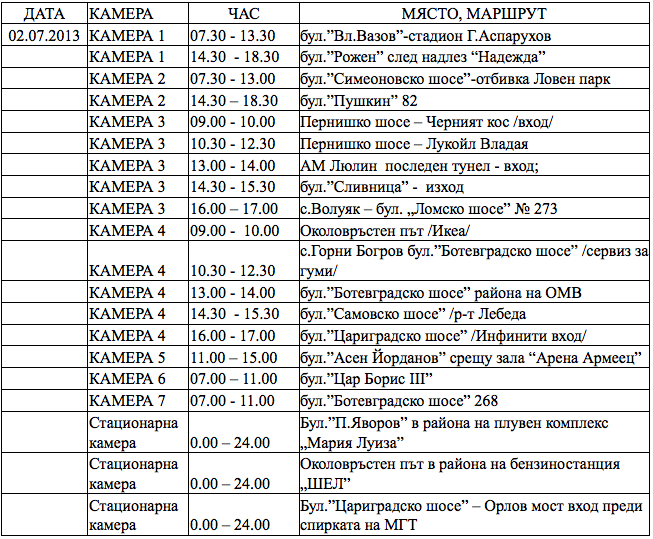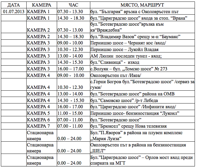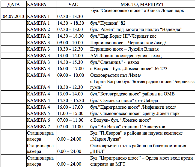 Ето графика на автоматизирани технически средства за контрол на пътното движение на отдел „ПЪТНА ПОЛИЦИЯ" – СДВР за 01, 02, 03 и 04 юли 2013г.