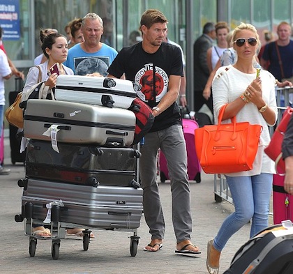 Миналата седмица Алекс Джерард показа забележителна колекция от бански костюми по време на почивката си в Португалия. Съдейки по голямата бройка багажи, с които капитанът на Ливърпул Стивън Джерард и семейството му се завърнаха на Острова, обаче изглежда, че блондинката е носила доста повече дрехи за своята ваканция. Грижовният съпруг буташе количка с четири големи куфара, като внимаваше никой да не падне на земята. В същото време майката на трите му дъщери се грижеше за децата и носеше единствено дамската си чанта под ръка.
