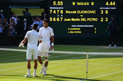 Джокович се поздрави днес с 9-а победа от 12 мача срещу Дел Потро, който тази година достигна до първия си полуфинал на "Уимбълдън". 26-годишният сърбин записа цели 22 аса срещу едва 4 за Дел Потро. Джокович реализира общо 80 уинъра срещу 48 за 24-годишния аржентинец. Делпо допусна малко по-малко непредизвикани грешки - 37, докато Ноле направи 48.