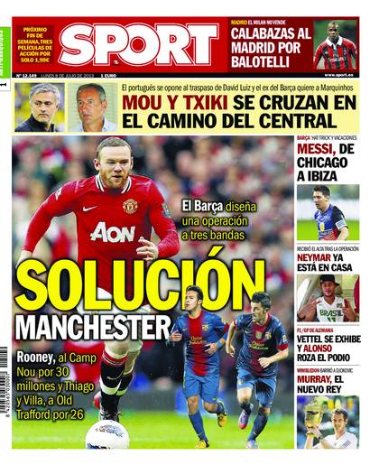 Тиаго вече е загубен, а Давид Вийя трябва да бъде разкаран, осъзнават от "Камп Ноу". "Синьо-червените" искат да продадат и двамата на Манчестър Юнайтед - 18 милиона евро за 22-годишния бразило-италианец и осем милиона за Ел Гуахе. Същото предложение включва Уейн Рууни да пристигне в каталунската столица срещу 30 милиона евро. Така на практика "лос кулес" ще платят четири милиона за английския национален нападател, като се разделят с Алкантара и голмайстор номер едно в историята на Испания.