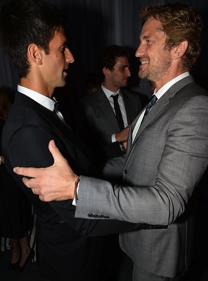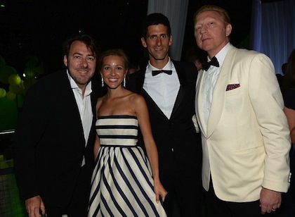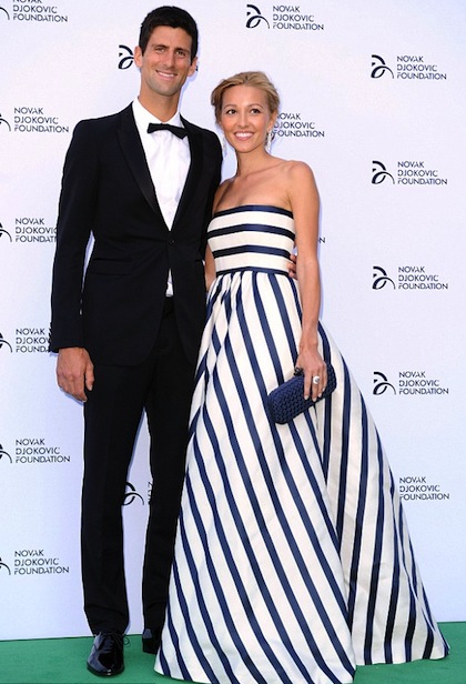 Въпреки че претърпя загуба на финала на "Уимбълдън", световният номер едно Новак Джокович бе домакин на благотворителна гала вечеря. Неговата дама Йелена Ристич обаче определено бе по-голямата звезда пред фотообективите. Тя изглеждаше великолепно с дълга синьо-бяла рокля на дизайнера Оскар де ла Рента, която струва 5800 паунда. Сръбският тенисист пък бе заложил на стилен черен костюм, бяла риза и папийонка.
