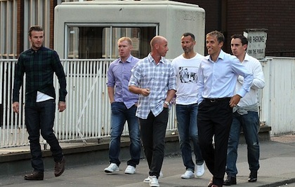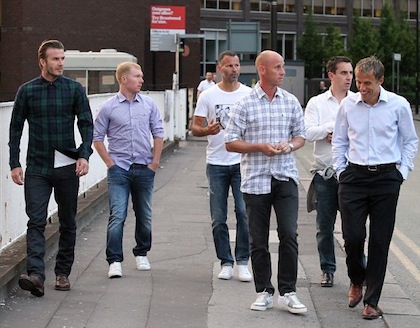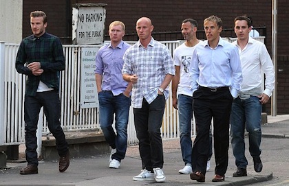 Бившият капитан на Англия Дейвид Бекъм реши да се върне назад във времето и се събра с бившите си съотборници от Манчестър Юнайтед, за да прекарат една вечер заедно. Бекс, Райън Гигс, Гари Невил, Фил Невил, Ники Бът и Пол Скоулс отидоха в елитен ресторант в Манчестър в понеделник вечерта, 22 години след като са подписали първите си договори с "червените дяволи". Шестимата бяха в добро настроение, а след като приключиха с вечерята, продължиха купона в нощен бар.