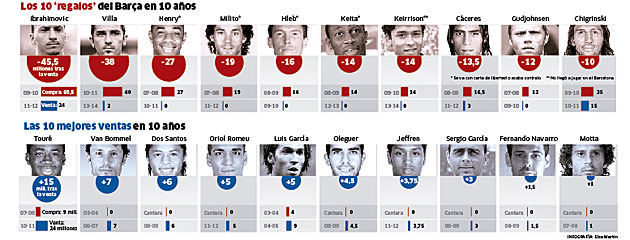 Отделно заслужава да бъде споменат Кейрисон де Соуза, за когото бяха дадени 14 млн. евро, а така и не игра за Барса. От Мартин Касерес бяха изгубени 13,5 млн. евро, а от Дмитро Чигринский – 10 милиона.