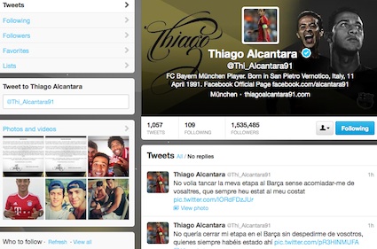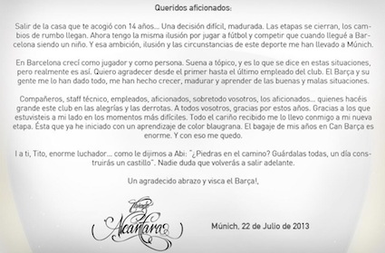 Полузащитникът на Байерн (Мюнхен) Тиаго Алкантара пожела да се обърне към всички, които обичат Барселона. "Не бих искал да приключа етапа си в Барса без да се сбогувам с вас, които винаги сте били до мен", написа 22-годишният халф в Twitter. Младежкият национал на Испания прикачи специално писмо към всички "синьо-червени" привърженици. Предлагаме ви пълния текст от обръщението, което е в два екземпляра - на испански и на каталунски език.
