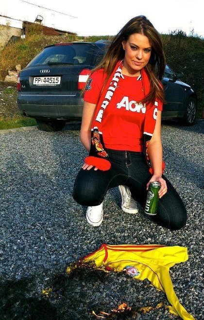 Интересна и провокативна снимка на сексапилна фенка на Манчестър Юнайтед се появи в социалната мрежа Twitter. Фотосът със сигурност ще се хареса на привържениците на "червените дяволи" и ще подразни доста тези на Ливърпул. На снимката момичето е с фланелка и шалче на Манчестър Юнайтед... но това не е всичко. Фенката, която държи в едната си ръка кенче с бира, е коленичила пред изгорена (вероятно от самата нея) жълта фланелка на Ливърпул.