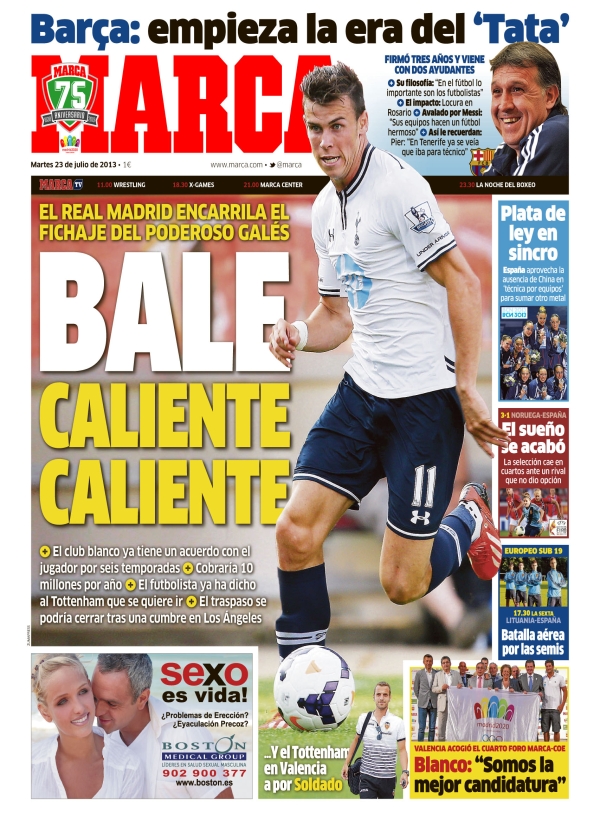 Най-четеният испански всекидневник "Марка" днес излиза с обширен материал за звездата на Тотнъм Гарет Бейл и евентуалния му трансфер в Реал Мадрид. Уелският щурмовак краси корицата на изданието, а голямото заглавие е "Бейл - топло, топло". 24-годишният офанзивен футболист вече е договорил личните си условия с "лос бланкос" - контракт за шест сезона със заплата от 10 милиона евро. Липсва договорка клуб-клуб.