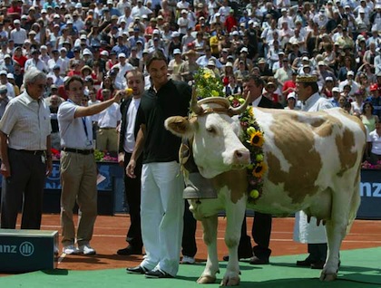 Сега историята се повтаря. Федерер бе голямата звезда на церемонията по откриването на надпреварата, а организаторите го изненадаха с нова крава, този път носеща името Дезире. Предишното животно, собственост на петия в света, се казваше Жулиета, а теленцето, което тя роди няколко месеца по-късно, бе кръстено Еделвайс от самия Роджър.
