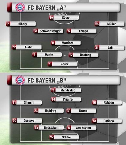 Байерн "А" (4-1-4-1): Нойер - Лаам, Данте, Боатенг, Алаба - Хави Мартинес - Швайнщайгер, Тиаго, Мюлер, Рибери - Гьотце