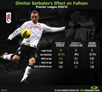 Сайтът WhoScored.com направи анализ на ефекта, който е оказал Димитър Бербатов върху играта на Фулъм през сезон 2012/2013. Според предложената статистика, резултатите на лондончани са най-добри, когато Бербатов играе на титулярния си пост - нападател. В срещите (26) в Премиър Лийг през миналия сезон, в които 32-годишният българин е бил в ролята на нападател, тимът от "Крейвън Котидж" има спечелени средно по 1,54 точки на мач и е излязъл победитл в 38,5% от изиграните си мачове.