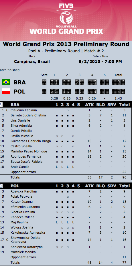 Олимпийският шампион и финалист в световните волейболни серии Гран При при жените за 2012 година - Бразилия, започна с победа в тазгодишното издание на състезанието. Волейболистките на "Селесао" дадоха гейм на Полша и ги биха с
