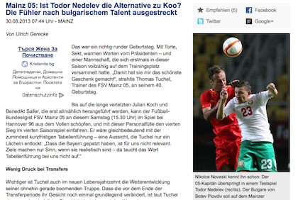 В днешния си брой германският вестник "Алгемайне Цайтунг" публикува материал по темата, озаглавен "Алтернатива ли е Тодор Неделев за Майнц 05?"
