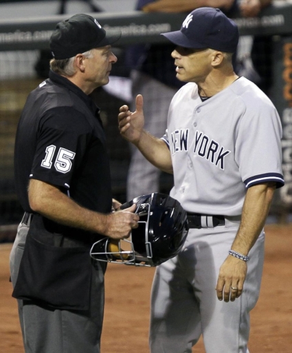 Мениджърите на Балтимор Ориолс и Ню Йорк Янкис – съответно Бък Шоуолтър (в гръб) и Джо Джирарди (в лице), едва не стигнаха до саморазправа по време на мача между двата тима от Американската лига на Мейджър лийг бейзбол (MLB). "Скорците" биха с 4:2 и откриха с успех домакинската си серия от общо 4 мача срещу "янките" на своя ст. "Ориол Парк", а двамата треньори се спречкаха при резултат 1:1 по средата на 2-рия ининг и едва бяха разтървани от съдиите и своите помощници.