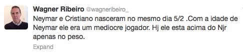 Агентът на Неймар Вагнер Рибейро "захапа" Кристиано Роналдо часове след подписания договор между нападателя и Реал Мадрид. "Неймар и Кристиано са родени на една дата - 5 февруари. На възрастта на Неймар Кристиано беше просто средняк", написа импресариото в Twitter.