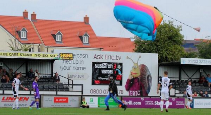 Момента, в който парашутистът се приземи на терена в мача Солзбъри Сити - Честър (видео)