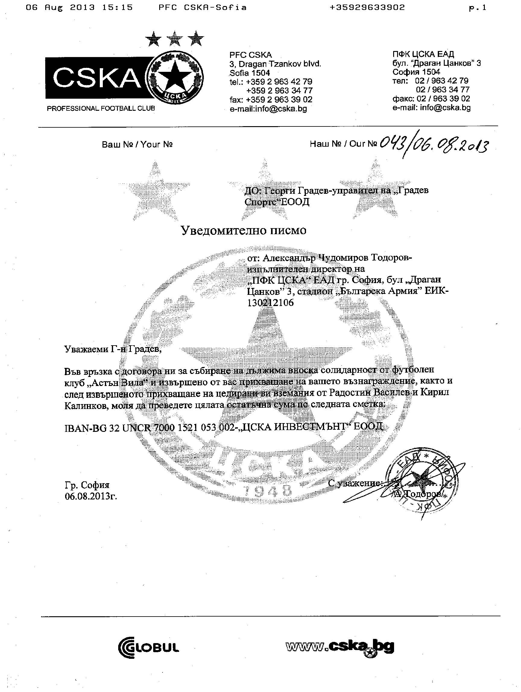 Второ, прилагам уведомително писмо, подписано от клеветника Тодоров, от което става ясно, че ПФК ЦСКА ЕАД (в лицето на Ал. Тодоров) признава дължимото вземане на ГРАДЕВ СПОРТС ЕООД по услугите извършени по събирането на съответната сума от Астън Вила, както и извършените цесии с юристите на клуба, а разликата до получената сума беше преведена на ЦСКА ИНВЕСТМЪНТ ЕООД още на следващия ден. Тук има основание за сезиране на прокуратурата, защото има явен опит за ощетяване на кредиторите на клуба и заобикаляне на закона от страна на клуба, управляван от клеветника, който ми нареди да преведа парите в дъщерно дружество.