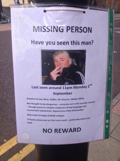 Фенове на Нюкасъл, недоволни от трансферната политика на клуба, си направиха майтап с футболния директор на "свраките" Джо Киниър чрез забавен постер, прикачен към улична лампа. На постера пише, че ирландецът е в неизвестност и за последно е бил видян "около 23 часа в понеделник, 2-и септември", когато бе затворен летният трансферен прозорец.