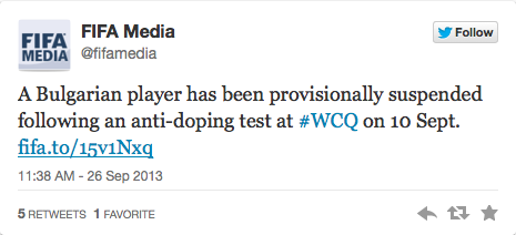 Световната футболна централа - ФИФА е спряла правата на български национал, който е дал положителна допинг проба след квалификацията за Мондиал 2014 срещу Малта в началото на месеца. Става дума за бранителя на Лудогорец Йордан Минев.