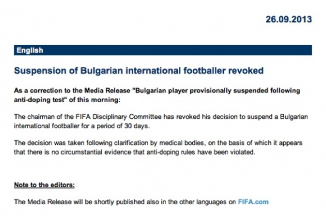 Българският футболен съюз бе официално уведомен за казуса от световната централа в сряда (25.09.2013 г.) По инициатива на президента Борислав Михайлов в четвъртък (26.09.) в сградата на БФС се проведе среща със самия футболист, негов адвокат, лекаря на националите д-р Бочев и изпълнителния директор на ПФК Лудогорец Ангел Петричев. На базата на представената документация бе изяснено, че в случая с Йордан Минев не става дума за допинг, а за разминаване в медицинските термини при описание на лечение на контузия.