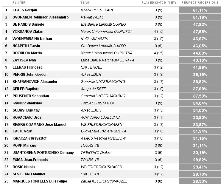 Лидер е Гертжан Клаес от белгийския Кнак (Рьозеларе) с 61,11% перфектно посрещане, следван от бразилецът Робинсон Дворанен от румънския шампион Ремат (Залъу) с 51,19% и либерото на италианския Бре Банка Ланути (Кунео) Даниеле Де Пандис с 47,92%.