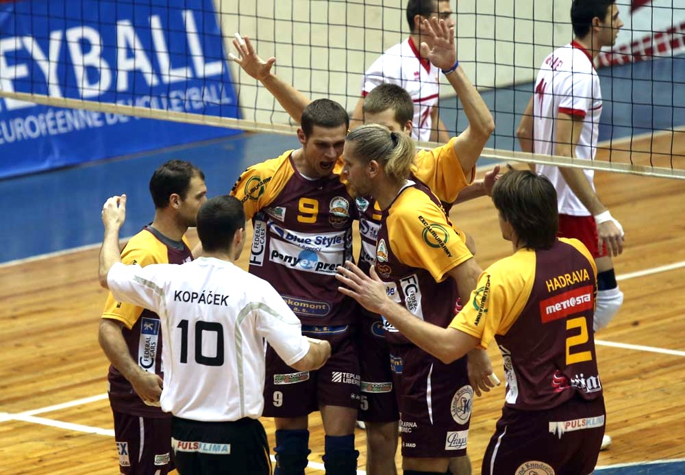 Двубоят ЦСКА – Дукла (Либерец) започна добре за чешките волейболисти, които поведоха с 5:2. Велизар Кьосев изравни при 5:5. Иван Крачев изведе „червените“ напред с 6:5 с мощна атака по диагонала. Двоен блок на ЦСКА и 7:5. Нова атака на Иван Крачев и „червените“ волейболисти поведоха с 8:6 при първото техническо прекъсване. Двоен блок Ивайло Стефанов – Петър Кирчев и 10:7. Дукла изравни при 10:10 с двойна блокада. Нов единичен блок на Лубомир Станек и чехите поведоха с 11:10 . Александър Попов взе прекъсване за „червените“. Раъйн Буроу направи аванса 13:10 за Дукла. Красимир Георгиев намали до 12:14 с атака в центъра. Атака в аут на Томас Хиски – 13:14. Адам Зайичек атакува мощно за 15:13. Второто техническо прекъсване дойде при 16:14 за Дукла. Ас на Томаш Хиски направи резултата 18:14. Сашо Попов взе второто си прекъсване в първата част. Влезар Кьосев намали на 15:18 с хубава атака по правата. Иван Крачев заби мощно за 16:18. Нова отлична атака на Крачев по диагонала и 17:18. Михал Некола взе първото си прекъсване в този гейм. Атака в аут на Петър Кирчев даде преднина на Дукла от 20:17. Ас на Иван Крачев сведе разликата само до 1 точка при 19:20. Ас на Райън Буроу – 23:20. Атака в аут на Лубомир Станек намали разликата – 22:23. Михала Некола взе второто си прекъсване. ЦСКА намали до 23:24 след грешно чешко разиграване. Адам Зайичек заби блок при атака на Ивайло Стефанов и така Дукла спечели първата част с 25:23.