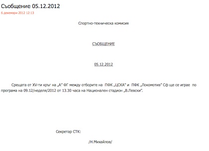 Мачът между ЦСКА и Локомотив (София) от предстоящия 15-и кръг на "А" група ще се играе в неделя от 13,30 часа на стадион "Васил Левски", разкриха официално от БФС. Решението на Спортно-техническата комисия е било взето още снощи, но беше съобщено едва днес по обяд (виж снимка №2).