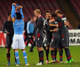 Носителят на купата на Италия Наполи отпадна от турнира по драматичен начин. Отборът на Валтер Мадзари загуби у дома от Болоня с 1:2 само няколко дни, след като същият съперник си тръгна с успех от "Сан Паоло" и в мач от първенството на Серия "А". Сценарият за домакините бе повече от кошмарен. Те отново водеха в резултата и допуснаха обрат. Както и в неделя, в ролята на палач на Наполи се превъплати гръцкият халф на Болоня Панайотис Коне. Той отново вкара много красив гол, с който гостите извоюваха победата и се класираха за четвъртфиналите. Там техен съперник ще е Интер.