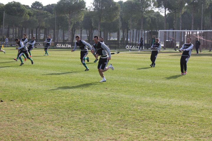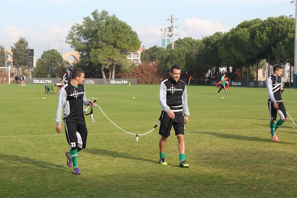 Треньорското ръководство на Лудогорец проведе интересна сутрешна тренировка на своите футболисти на един от терените в комплекс "Глория" в Белек. След задължителната загрявка, играчите се обособиха по двойки, като единият бе с колан на кръста, а другият го държеше от разстояние, като ги свързваше ластик. Целта бе да има съпротивление, за да може бягащият отпред състезател да се натовари повече. С това упражнение се подобрява бързината, мощта и устойчивостта на футболистите. Заниманието продължи със сухо тичане, което доста поизмори възпитаниците на Ивайло Петев.