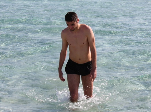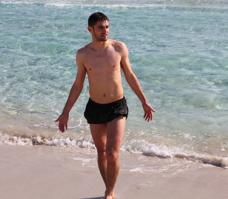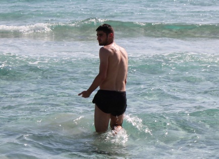 След интензивната сутрешна тренировка на отбора Димов бе първият, който се появи на плажа до петзвездния хотел Енеас, за да се изкъпе в морето.