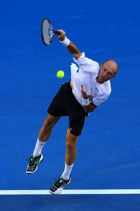 Световният номер 2 Роджър Федерер се класира за третия кръг на Откритото първенство на Австралия, след като записа 18-ата си победа от 20 мача срещу Николай Давиденко. Швейцарецът, който има четири титли от надпреварата в Мелбърн, отстрани рускиня си съперник с 6:3, 6:4, 6:4 след час и 59 минути игра. В третия кръг 31-годишният Федерер ще се изправи срещу 11 години по-младия от него представител на домакините Бърнард Томич.